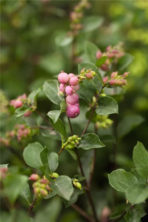 Besonders dekorativ sind die purpurroten, ovalen Beeren von Symphoricarpos x doorenbosii. Diese erscheinen ab Juli. Haften sehr lange.