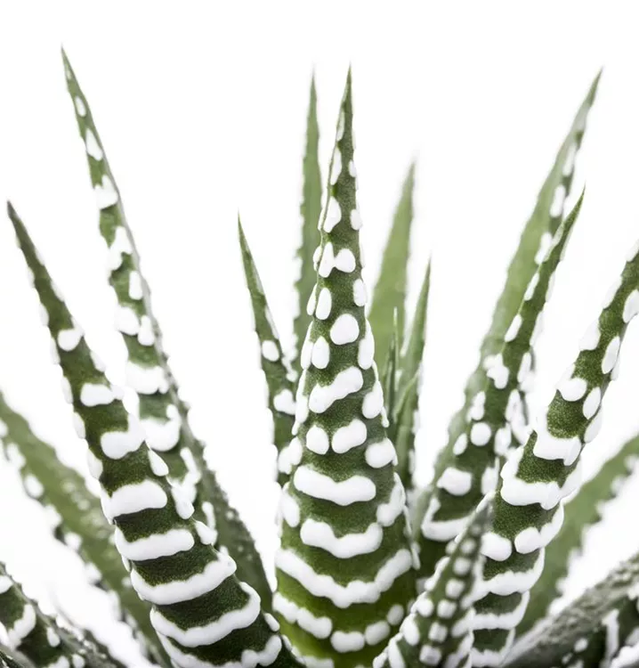 Die Blätter der Haworthie sind grün-weiß, lanzettlich, gezähnt.
