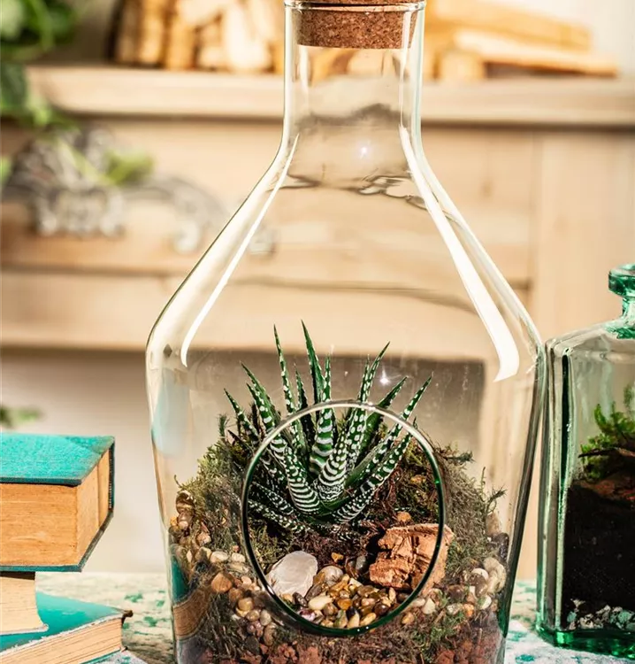 Die Haworthie (Haworthia fasciata) ist eine Pflanze mit grün-weißen, lanzettlichen, gezähnten Blättern. Die röhrenförmigen Blüten erscheinen in Ähren von Januar bis Dezember. Diese rosettenartige und sukkulente Pflanze gedeiht am besten an einem sonnigen Standort.