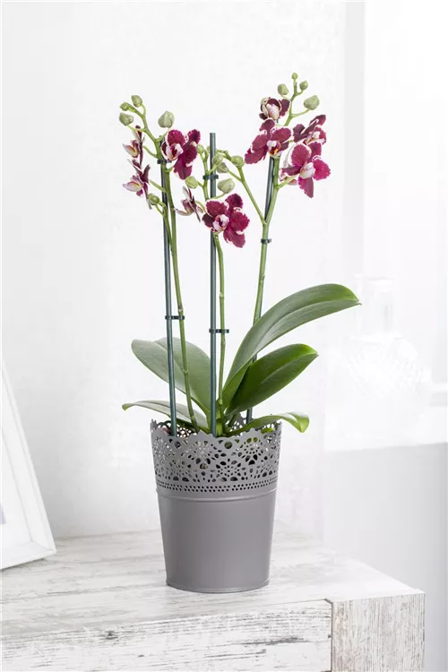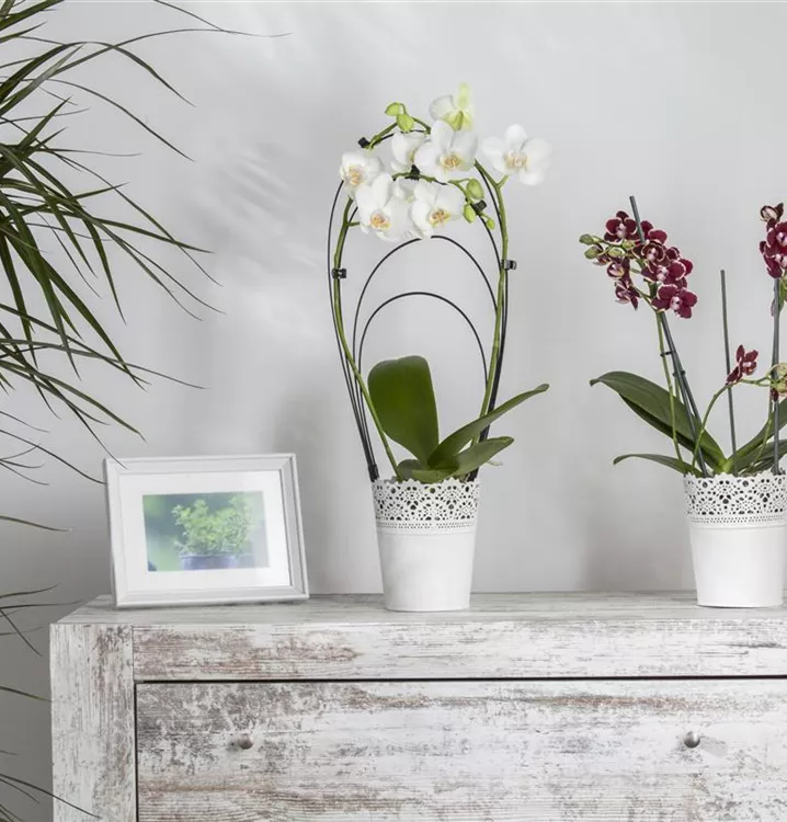Die Schmetterlingsorchidee (Phalaenopsis) ist eine schöne, in verschiedenen Farben blühende Orchidee. Ihre lippenförmigen Blüten sind sehr dekorativ und erscheinen in Rispen von Januar bis Dezember. Für das optimale Wachstum sorgen ein heller Standort sowie ein spezielles Orchideen-Substrat.