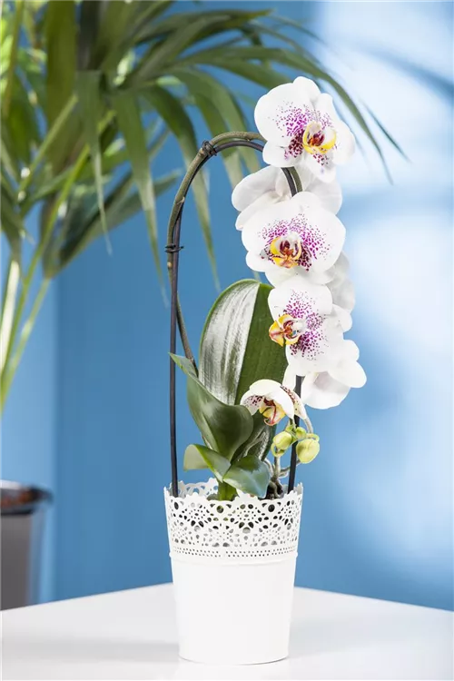 Die Schmetterlingsorchidee 'Waterfall' (Phalaenopsis) ist eine schöne, in verschiedenen Farben blühende Orchidee. Ihre lippenförmigen Blüten sind sehr dekorativ und erscheinen in Rispen von Januar bis Dezember. Für das optimale Wachstum sorgen ein heller Standort sowie ein spezielles Orchideen-Substrat.