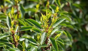 Die immergrünen Blätter der Portugiesische Lorbeerkirsche sind dunkelgrün, lanzettlich, glänzend, wechselständig. Diese sind etwa 6 - 12 cm groß.