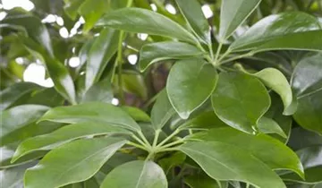 Die Strahlenaralie (Schefflera arboricola) trägt dunkelgrüne, handförmige Blätter. Diese strauchartige Pflanze gedeiht am besten an einem sonnigen bis halbschattigen Standort.