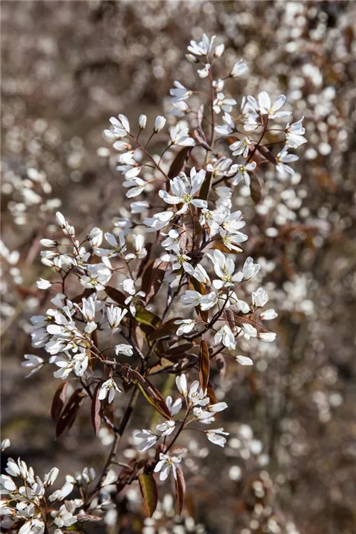 Die Säulen-Felsenbirne 'Rainbow Pillar'® (Amelanchier lamarckii) ist eine säulenförmige Gartenpflanze, die weiße Blüten hervorbringt. Sie erscheinen von April bis Mai. Besonders dekorativ ist der rote Jungaustrieb. An einem sonnigen bis halbschattigen Standort mit durchlässigem, humosem Boden erreicht sie gewöhnlich eine Höhe von ca. 5 m und wird ca. 2 m breit.