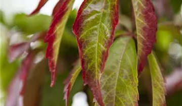 Die sommergrünen Blätter des Wilden Weins sind dunkelgrün, gefingert, wechselständig. Diese sind etwa 8 - 10 cm groß. Wilder Wein zeigt sich leuchtend scharlachrot im Herbst.