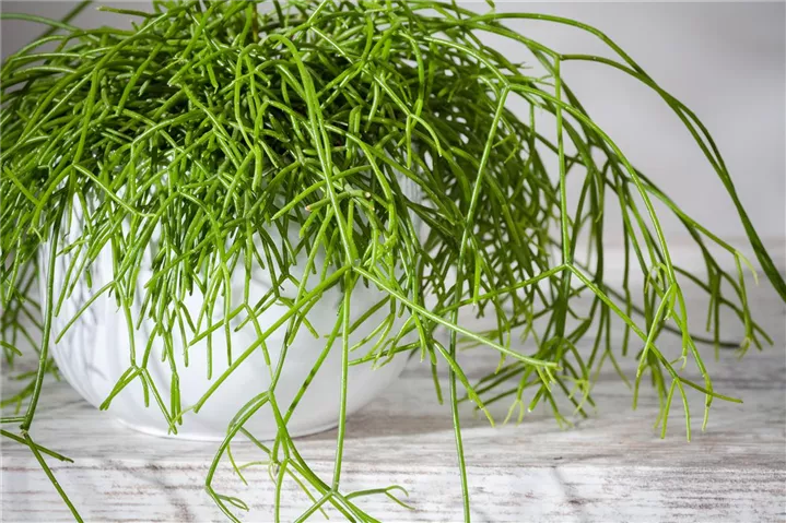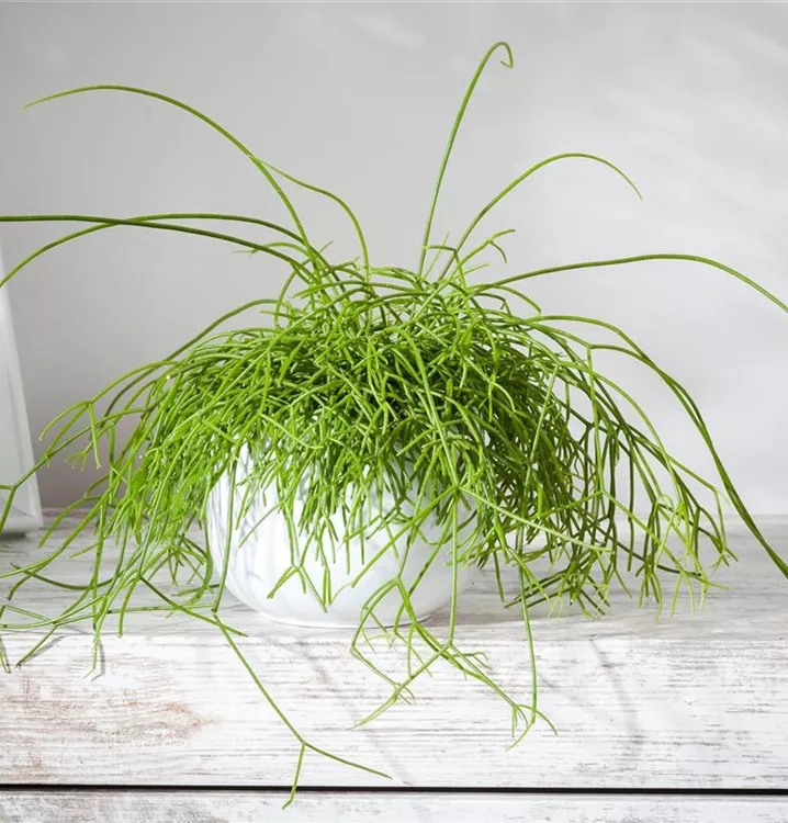 Die immergrünen Blätter des Binsenkaktuses sind hellgrün, dickfleischig.