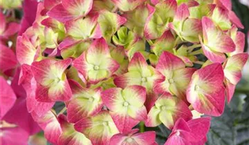 Die rosaroten, schalenförmigen Blüten der Bauernhortensie erscheinen in Dolden von Juni bis September.