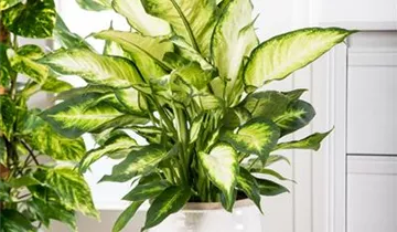 Die immergrünen Blätter der Dieffenbachie sind dunkelgrün, lanzettlich.