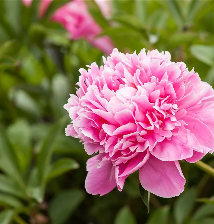 Die Garten-Pfingstrose, rosa (Paeonia lactiflora) ist eine aufrechte, ausladende Staude, die von Mai bis Juni rosafarbene, schalenförmige Blüten mit einem angenehmen Duft bildet. An einem sonnigen Standort mit humosem, nährstoffreichem, lehmigem Boden erreicht sie gewöhnlich eine Höhe von ca. 1 m und wird ca. 1 m breit. Die Garten-Pfingstrose, rosa ist gut frostverträglich.