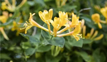 Die Feuer-Geißschlinge (Lonicera heckrottii) ist eine buschige, rankende Gartenpflanze mit dekorativen, roten Früchten. Die röhrenförmigen Blüten erscheinen je nach Sorte in verschiedenen Farben.