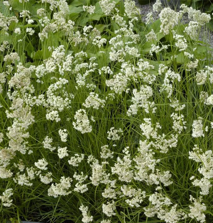 Die Schnee-Hainsimse (Luzula nivea) ist mit ihrer mittelgrünen Blattfärbung ein dekoratives Gestaltungselement im Garten, welches sich an einem halbschattigen Standort mit einem möglichst durchlässigen, humosen Boden am wohlsten fühlt. Die weißen Blütenwedel schmücken die buschig, breit und dicht wachsende Pflanze ab Sommer. Bei günstigen Bedingungen erreicht dieses winterharte Gras eine Höhe von ca. 20 cm und wird bis zu 20 cm breit.