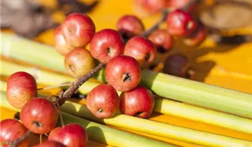 Besonders dekorativ sind die Früchte von Malus Hybride. Diese sind klein.
