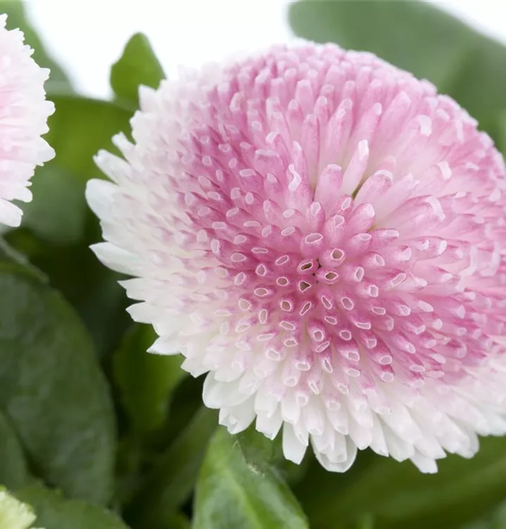 Bellis perennis bildet rosafarbene, rote, weiße Blüten ab Februar.