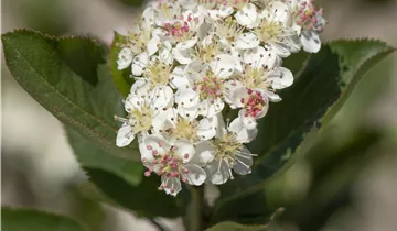 Aronia melanocarpa bildet in Rispen angeordnete, weiße Blüten ab Mai.