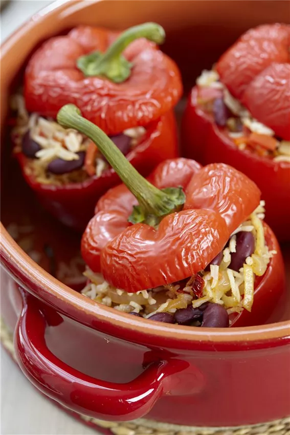 Die Reis-Masse in die restlichen Paprika füllen. Die Deckel wieder draufsetzen und dann in einer Auflaufform bei 200 Grad ca. 30 Minuten backen lassen.