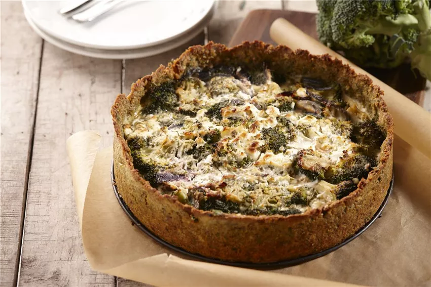 Die Form aus dem Ofen nehmen und die Masse mit Brokkoli darüber verteilen. Dann wieder in den Ofen schieben und weitere 30 Minuten fertig backen. Die Quiche zum Servieren in Kuchenstücke schneiden.