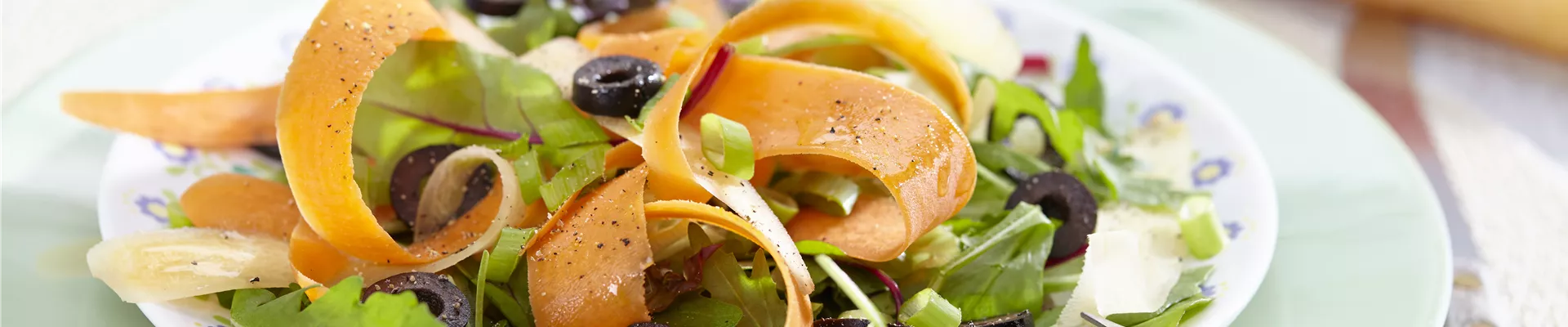 Rucola und Feldsalat gut waschen, dann die Oliven und Frühlingszwiebeln klein schneiden. Die Karotte waschen, schälen und dann mit einem Sparschäler in Streifen schneiden.