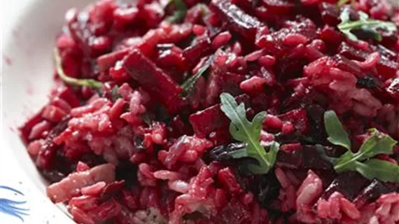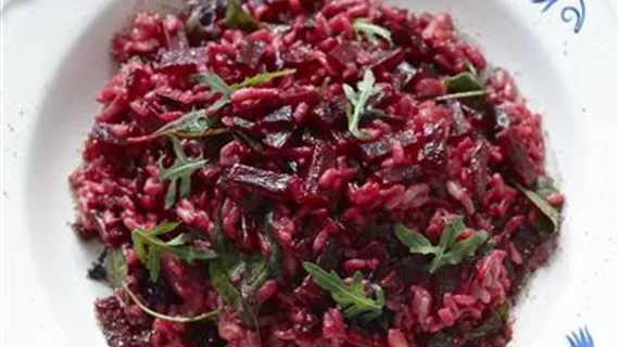 Etwas von der Brühe hinzugeben, bis der Reis leicht bedeckt ist, dieses nun solange verrühren bis alles eingezogen ist. Dies wird ca. 18 Minuten wiederholt, bis der Reis bissfest ist. Dann die Rote Beete und den Rest der Butter hinzugeben und ca. 4 Minuten weiterköcheln lassen.